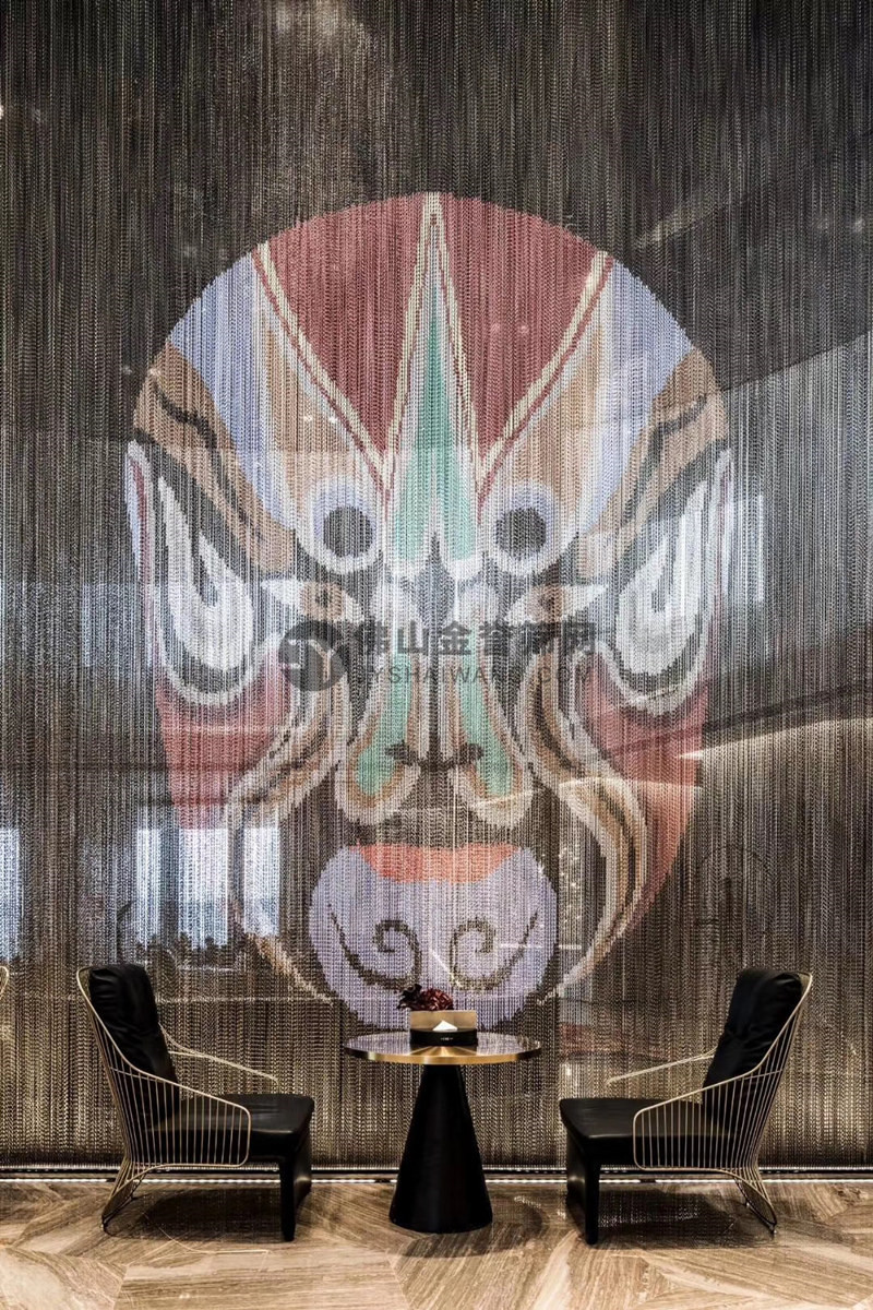 金屬垂簾采用優(yōu)質(zhì)鋁合金絲,銅絲,不銹鋼絲等編織,成品可以是金屬本來(lái)的顏色,也可以噴圖成古銅,烏木黑,棗紅等其他顏色,寬度、高度可以隨意定。該產(chǎn)品具有莊重,大方,立體效果好等特點(diǎn),在燈光照射下更顯魅力,是現(xiàn)代賓館,飯店,展廳等理想的裝飾材料。